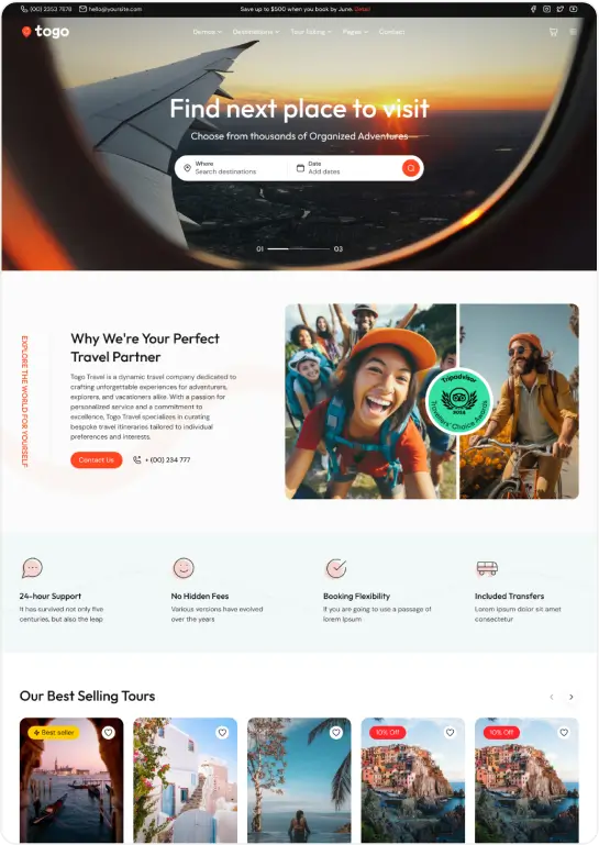 Togo – Travel & Tour Booking WordPress Theme is a modern and easy-to-use theme for travel agencies and tour operators. It offers powerful booking features, customizable itineraries, seasonal pricing, and WooCommerce support—perfect for creating a professional tour booking website.