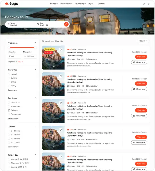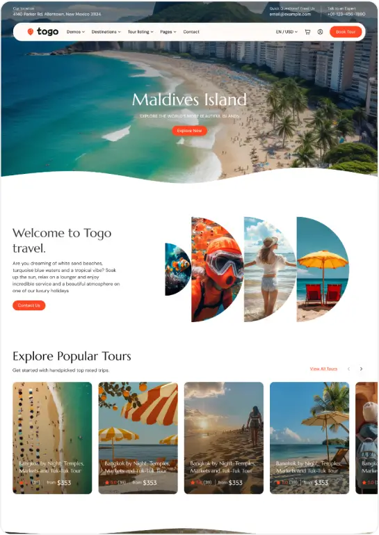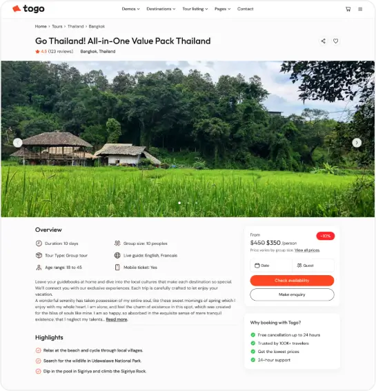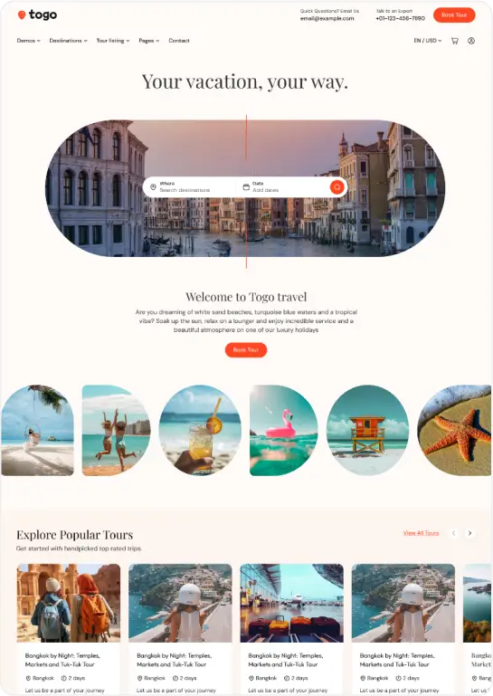 Togo is a professional WordPress theme that makes it easy to build a modern, beautiful tour booking website with full features for reservations, payments, and tour management.